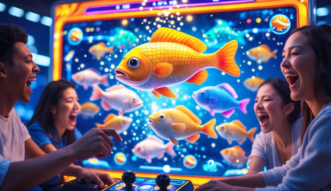 Beberapa orang sedang bermain game tembak ikan dengan layar penuh warna dan efek jackpot besar.